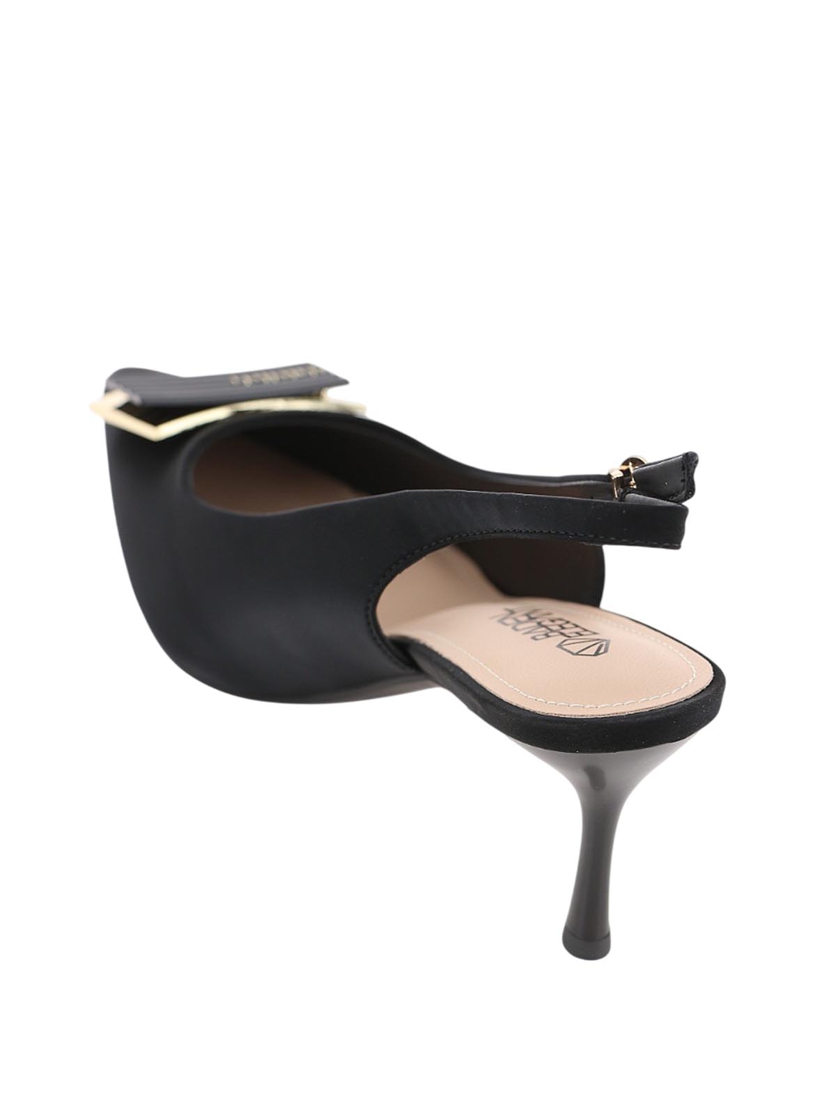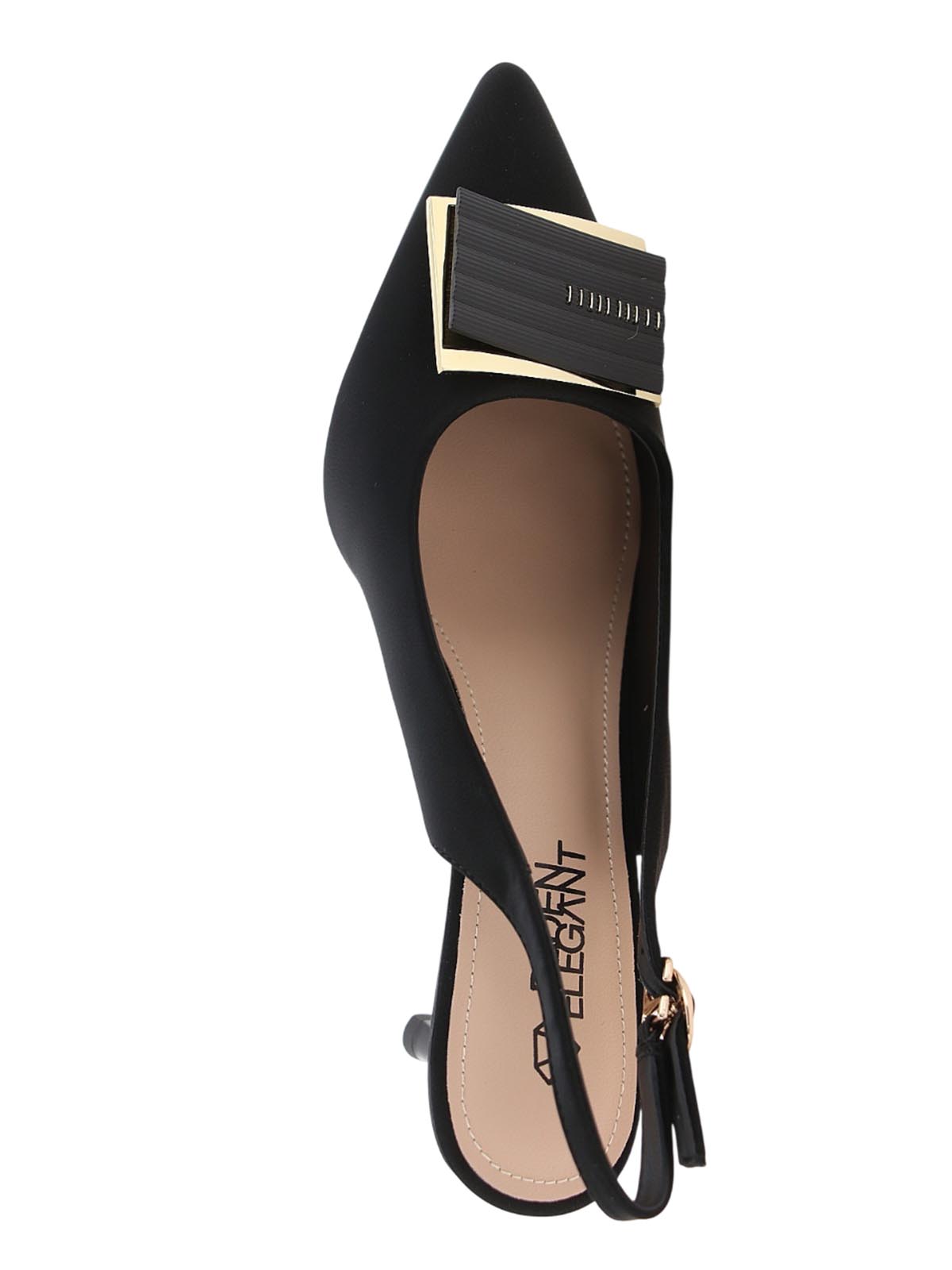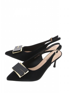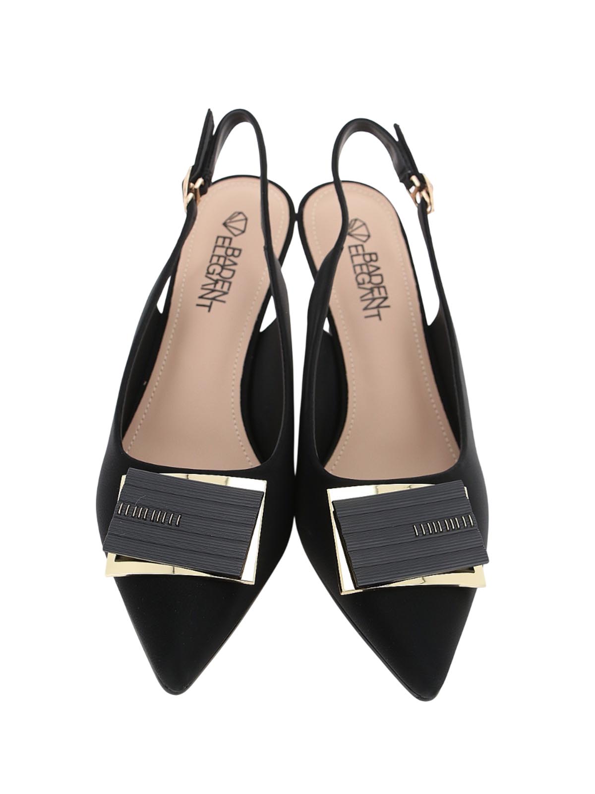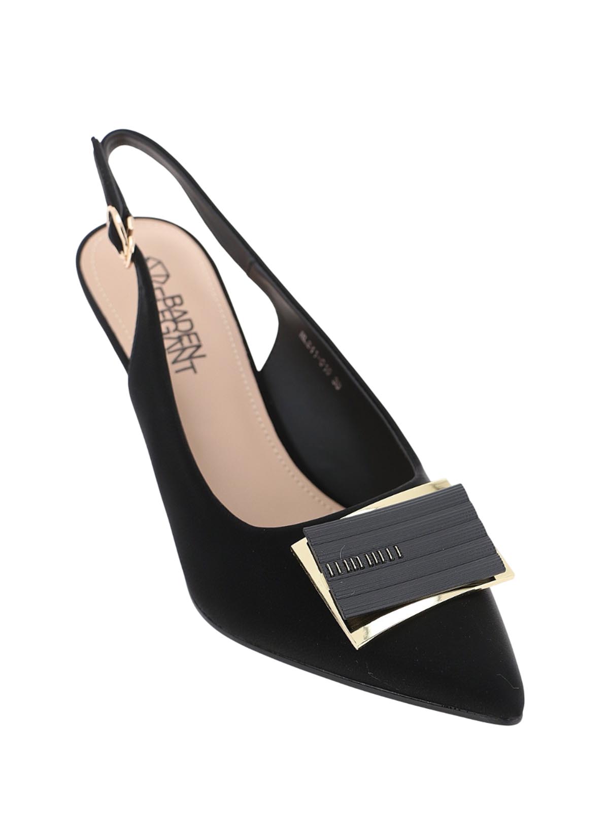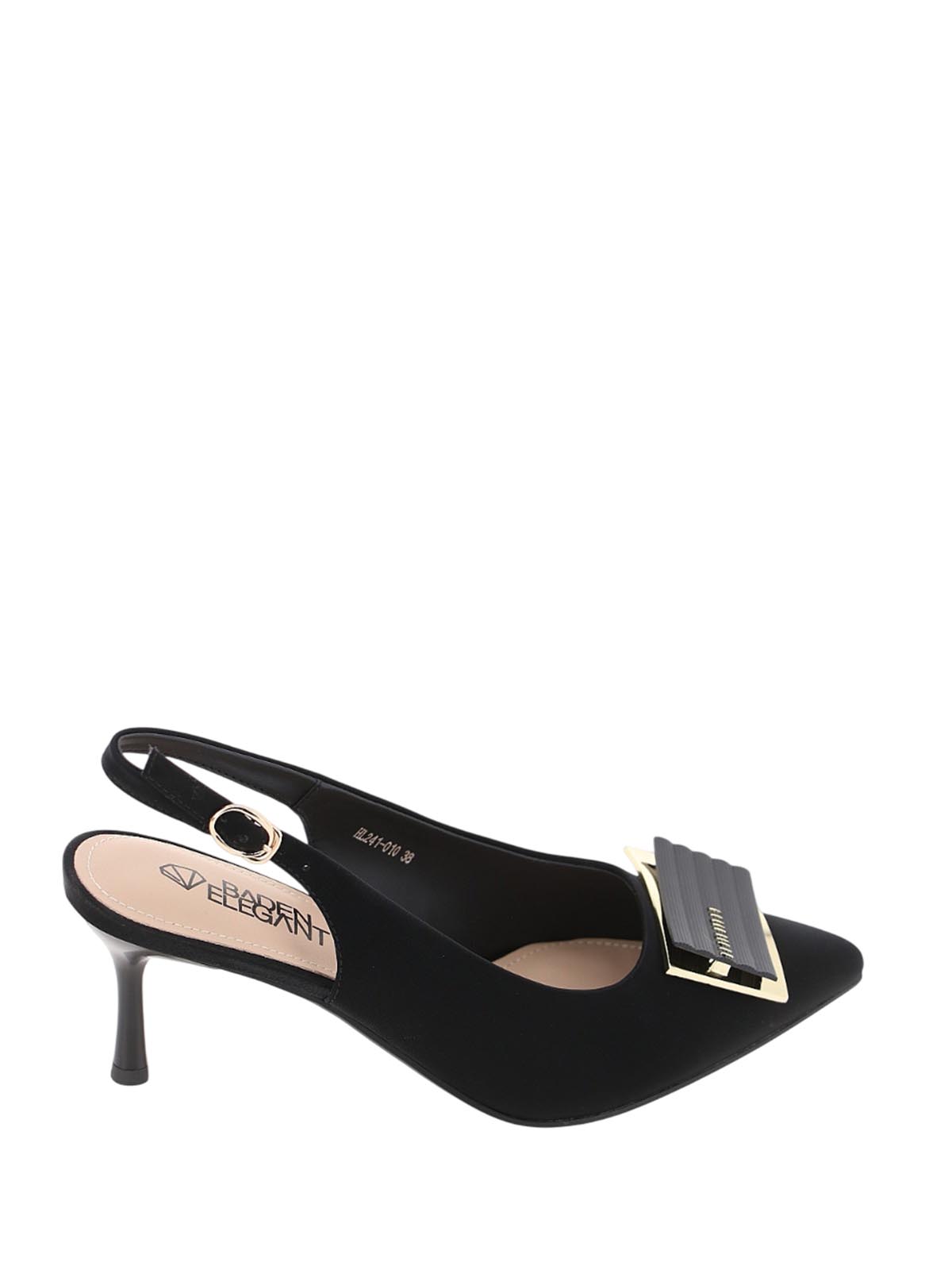 Женские летние черные туфли BADEN в стиле элегантной классики с выразительным дизайном. Модель с острым носом, открытой пяткой, каблуком-рюмочкой и массивной декоративной пряжкой сочетает изящество силуэта и эффектный акцент для теплого сезона.